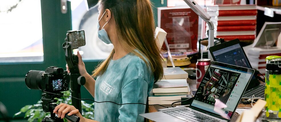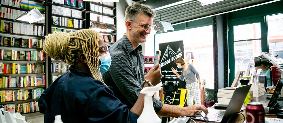 „Wir haben daher Online Veranstaltungen organisiert und wussten, dass wir damit Menschen von außerhalb der Stadt anlocken konnten, uns zu besuchen.“ Tatsächlich erhöhte das die Aufmerksamkeit von Leuten außerhalb der Stadtgrenzen. Mithilfe des Goethe-Hilfsfonds konnte Bridge Books die Technik für Streamingformate anschaffen, die Mitarbeiter*innen schulen und somit die digitale Qualität verbessern und die Reichweite ausbauen.