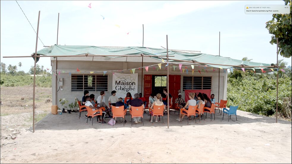 Vor dem temporären Versammlungsraum des Maison Gbegbe; Gregor Kasper und Musquiqui Chiying unterhalten sich mit Studenten der UdK und der Universität von Lome bei den Gbegbe-Tagen, Videostill, 2022
