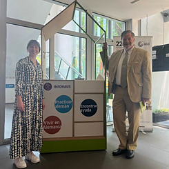 Regionalkoordinatorin der Region Nordamerika Margaretha Weckenbrock und der deutsche Botschafter in Mexiko Wolfgang Dold mit einem Infohaus am Goethe-Institut Mexiko