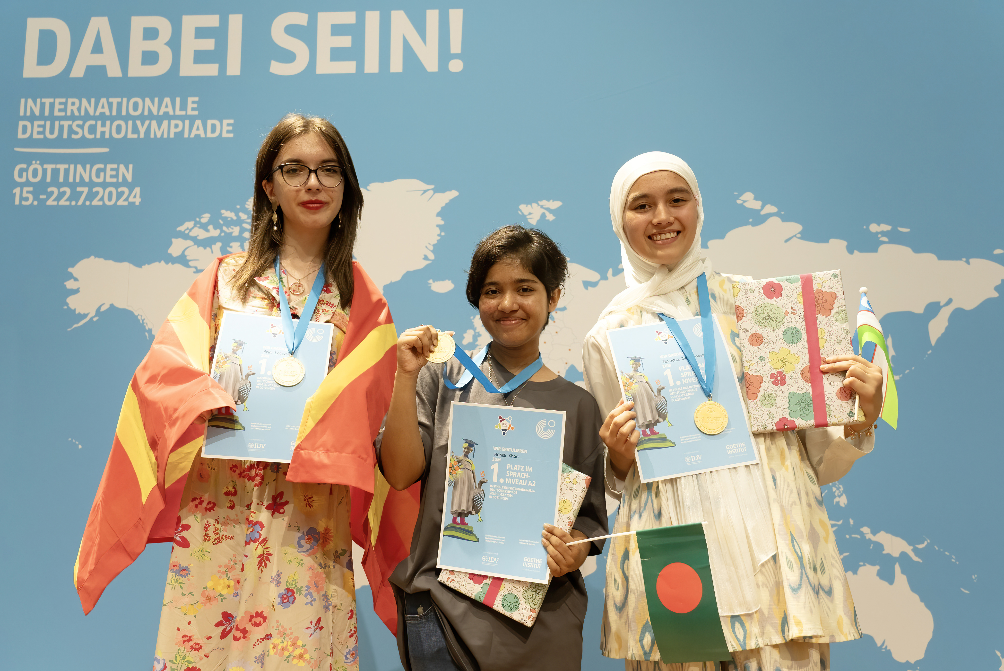 Die Gewinnerinnen um den Titel der weltbesten Deutschlernenden 2024 stehen fest: Mahek Khan aus Bangladesch, Rayyona Ibrokhimova aus Usbekistan und Ana Kotevska aus Nordmazedonien sind die jeweils Erstplatzierten in den drei Wettbewerbs-Sprachstufen (A2, B1 und B2) der Internationalen Deutscholympiade (IDO).