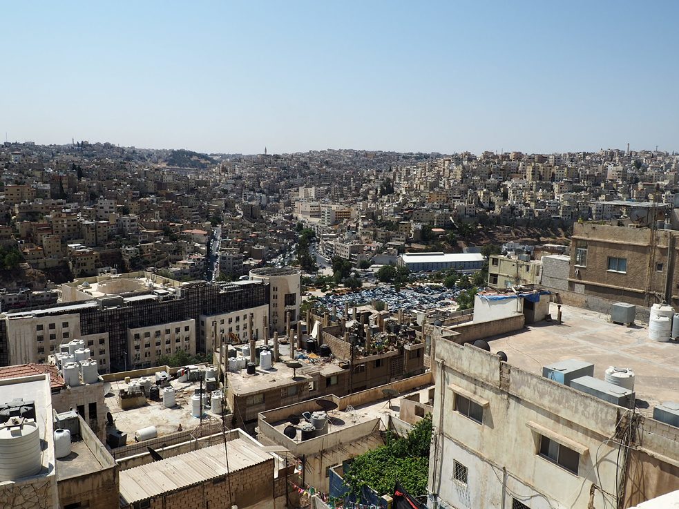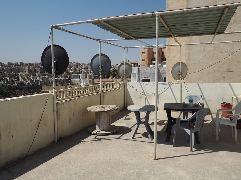 Nachdem ich am Vorabend spätabends in meiner WG in Amman angekommen bin und leider nichts mehr von der Stadt sehen konnte, bin ich vom Anblick der Stadtkulisse am nächsten Tag umso beeindruckter. Die Lage an der höher gelegenen Rainbow Street vom Rooftop des Hauses, auf dem auch die Tanks für die Wasserversorgung gelagert werden, ist wirklich wahnsinnig schön, und doch so fremd und ungewohnt, dass ich erstmal eine Zeit brauche, um die neuen visuellen Eindrücke zu verarbeiten.