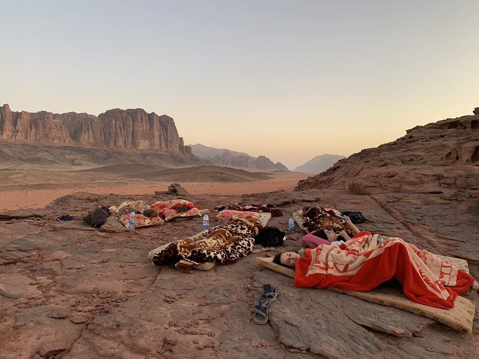 Nach zwölf Kilometern kamen wir mitten in der Wüste an. Auch wenn es in Wadi-Rum gefühlt 100 Beduinen-Camps gibt und die Wüste als absolutes Touristen-Highlight gilt, hat man hier doch das Gefühl in einer surrealen Welt alleine zu sein. Die Stille und Einsamkeit bildet einen starken Kontrast zum lebendigen Amman und dem lauten Schulalltag. Ich könnte stundenlang auf den Felsen sitzen und mich an dem unglaublichen Panorama der Wüste einfach nicht satt sehen. Der Nachmittag wurde mit einem traditionell im Sand geschmorten Essen und einem offenen Feuer mit Tee perfekt abgeschlossen. Als es dunkel wurde, entschieden wir uns dazu auf dem Felsen draußen zu schlafen und hatten dabei einen Ausblick auf den Sternenhimmel, der sich in der Wüste natürlich von seiner besten Seite zeigt. Eine wirklich unglaublich schöne Erfahrung, die ich während meiner Zeit hier auf jeden Fall nochmal wiederholen werde!