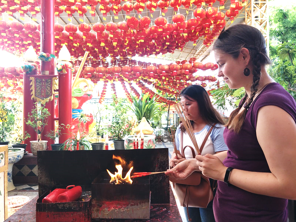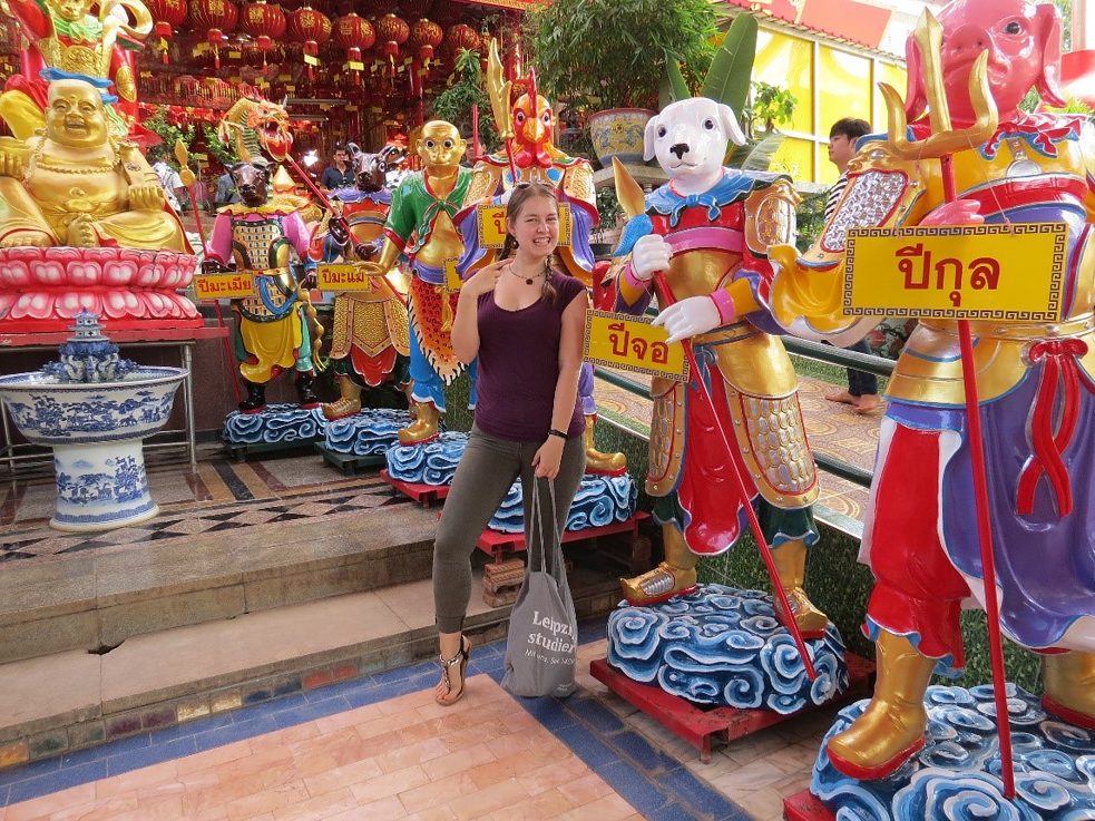 Etwa 14% der Thailänder sind ethnische Chinesen und in vielen Städten gibt es chinesisch geprägte Tempel. Ein besonders schöner Tempel steht auf einem Berg östlich von Phitsanulok. Meine Betreuerin hat mit meiner Kollegin von den Philippinen und mit mir diesen Tempel besichtigt. Der Tempel ist in der Region sehr beliebt und erhält viele Spenden, dadurch kann der Tempel jeden Tag für alle Besucher kostenloses Essen anbieten. Die ganze Tempelanlage ist sehr reich verziert und überall stehen unterschiedlichste religiöse Figuren. Von den Tieren des chinesischen Jahreskalenders, über legendäre chinesische Herrscher zu Personifizierungen der Elemente und Himmelsrichtungen ist dort alles vertreten. Ich kannte nur einen Bruchteil der angebeteten Figuren, aber meine Betreuerin gab uns ausführliche Erklärungen.