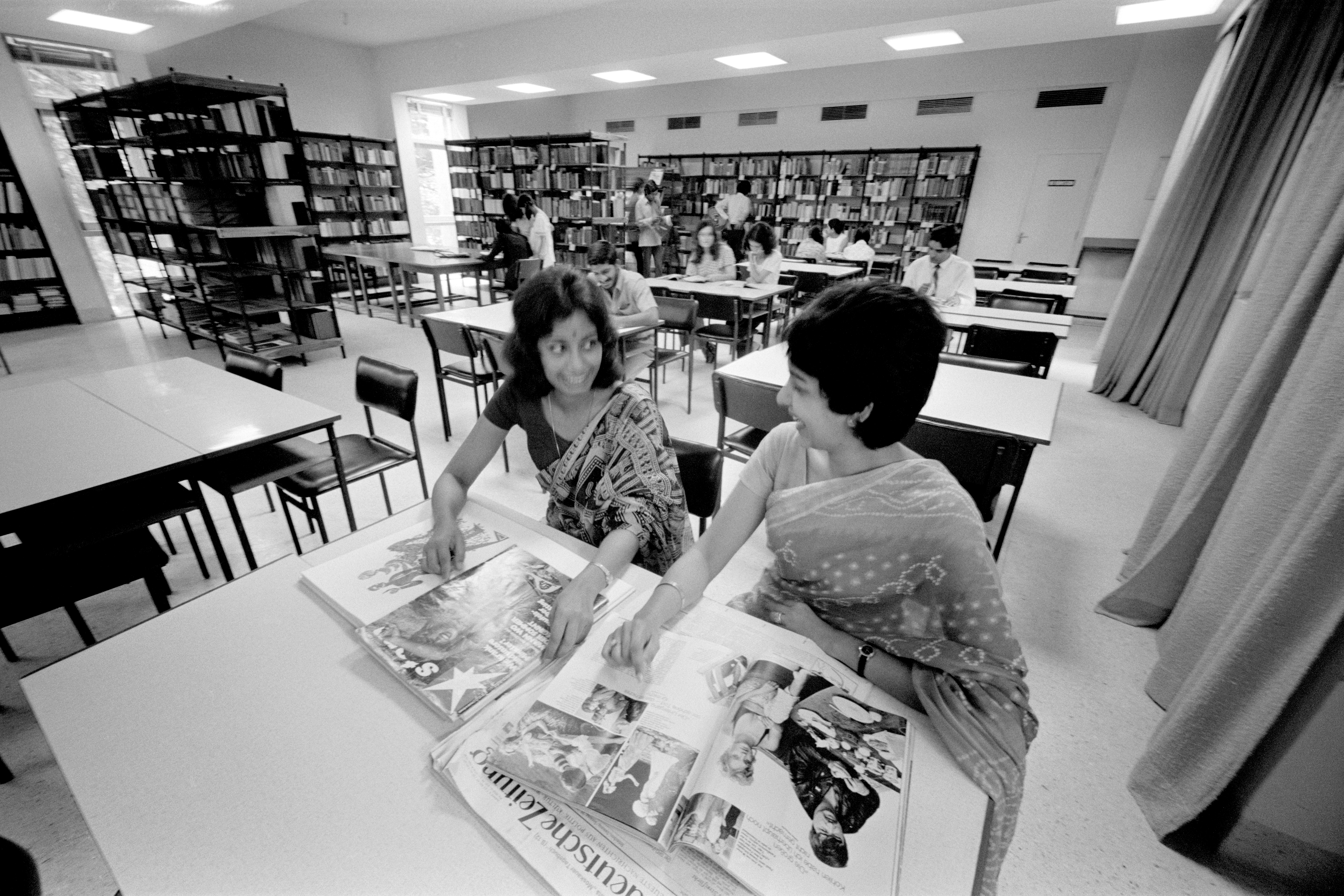 Besucher*innen des Goethe-Instituts Mumbai nutzen den Lesesaal der Bibliothek 1973, um deutsche Zeitungen und Zeitschriften zu lesen.