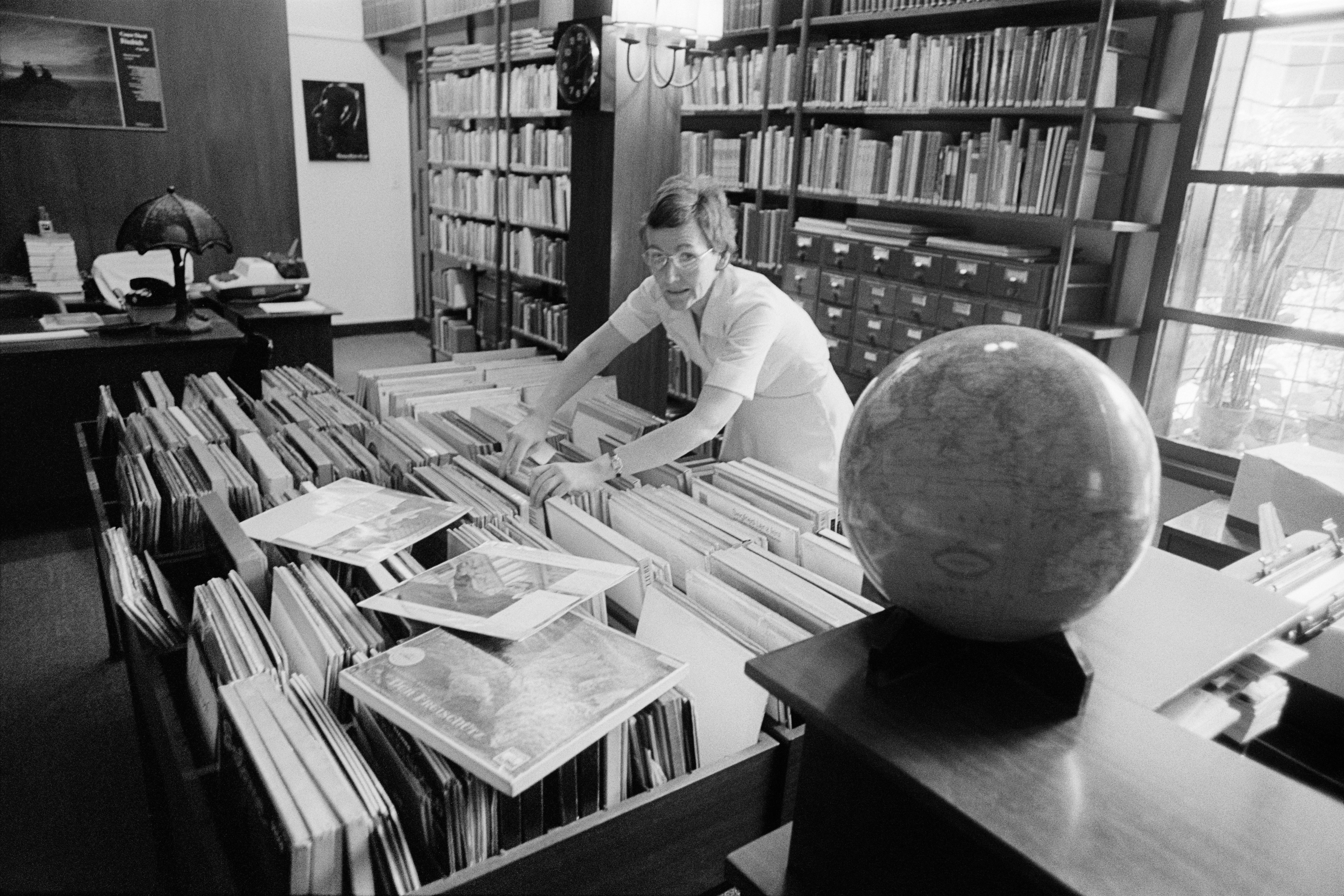 Die Bibliothek des Goethe-Instituts Manila im Jahr 1976: Die Verwaltungsleiterin Anneliese Santos beim Sortieren der Printmedien.