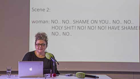Eine der Feministinnen, die ihre Arbeit präsentieren, ist Salma El Tarzi. Die preisgekrönte Dokumentarfilmerin arbeitet aktuell zu Sexismus im kommerziellen ägyptischen Film. In einer Installation sowie einem Vortrag analysiert die Kairoerin, wie Vergewaltigung und sexuelle Übergriffe filmisch normalisiert werden und so gesellschaftliche Verhältnisse gleichzeitig spiegeln wie manifestieren. Die Vierzigjährige projiziert übergriffige Szenen aus populären Filmen an die Wand. Während der Wiedergabe lachen einige Männer im Publikum. El Tarzi ist darüber sichtlich erzürnt. Sie kommentiert anschließend: „Worüber wir lachen, das sind physische Übergriffe, Vergewaltigungsversuche und Hausfriedensbruch. Wie können wir so etwas sehen und denken, dass es lustig ist? Das ist total normalisiert.“ Das Publikum applaudiert. Eine performative Art feministischer Vernetzung.