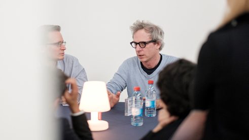 Alexis Nouss diskutiert während eines Rundtischgesprächs mit dem Publikum