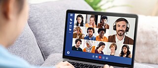 • A participant sits on her sofa as she participates in a virtual lesson using a video conference tool. © Goethe-Institut