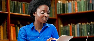 • A course participant studies in the library using the online platform on her tablet. © Goethe-Institut