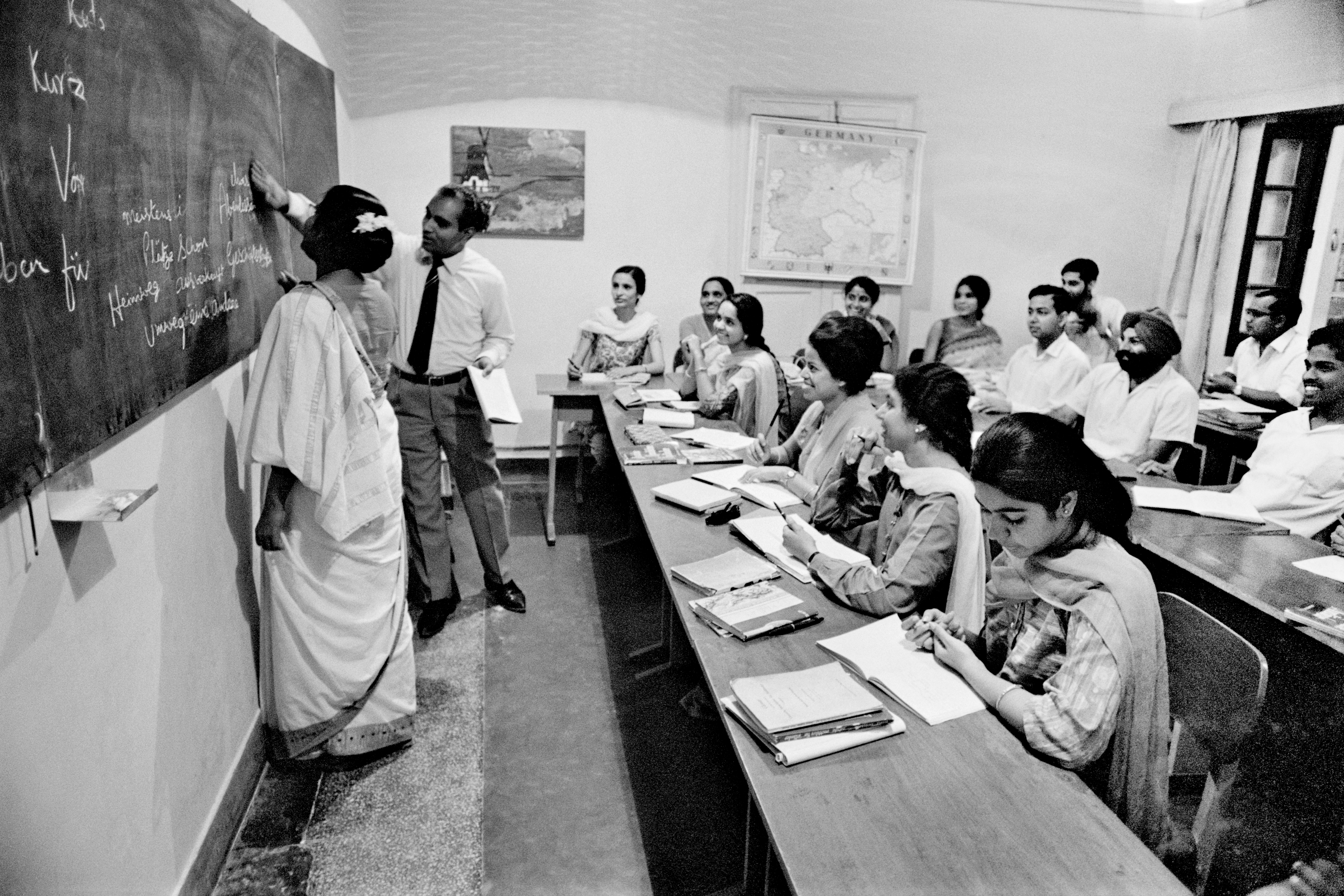 In the 1950s, language classes frequently looked like this one at the Goethe-Institut Delhi, where textbooks, notebooks and the teacher’s chalkboard were the most important learning tools.