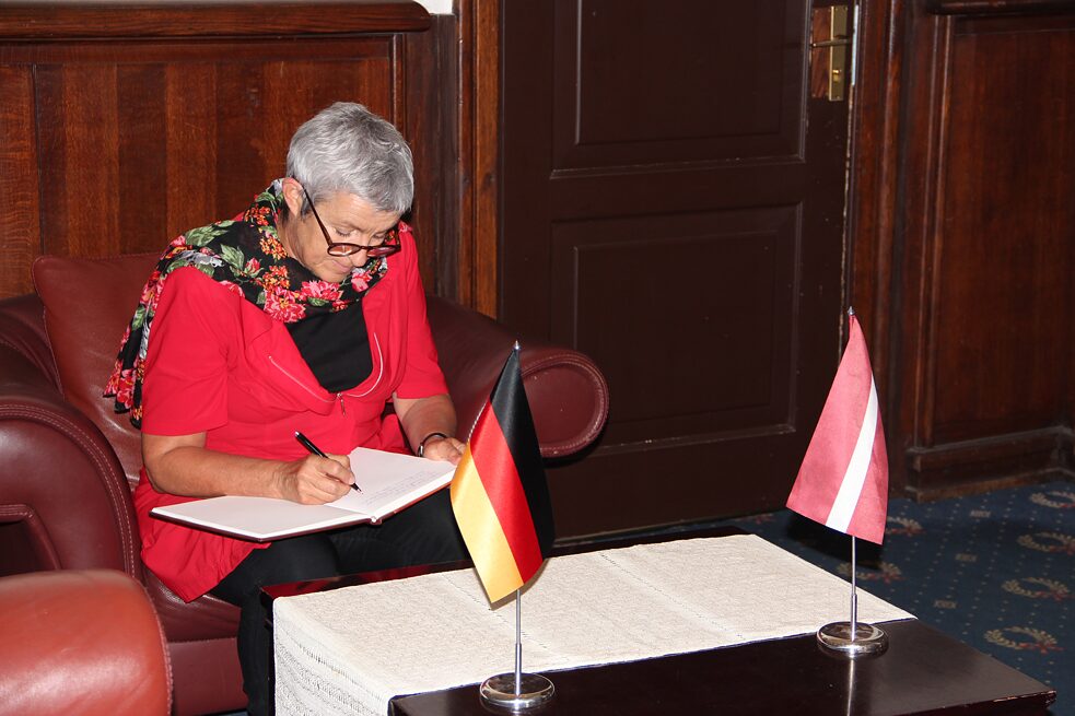 Carola Lentz signing the guest book of the Occupation Museum in Riga. | Photo (detail): © Goethe-Institut Lettland