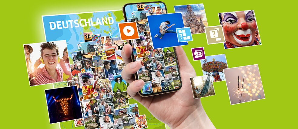 Our largest target group is the approximately 13.5 million pupils learning German at schools. Children and young people are usually less interested in grammar, but all the more fascinated by life in Germany. For this purpose, we developed the Deutschlandcollage – a map of Germany in a fresh design with interactive augmented reality functions – and the app Deutschland. Kennen. Lernen.The free Deutschlandcollage invites young learners of German at A2 level to get to know more about life in Germany. The six topics range from leisure activities and research to environmental awareness and pop culture to everyday student and working life. Interactive exercises and narrative media elements such as short films provide variety and enable users to improve their vocabulary as well as their reading and listening comprehension.