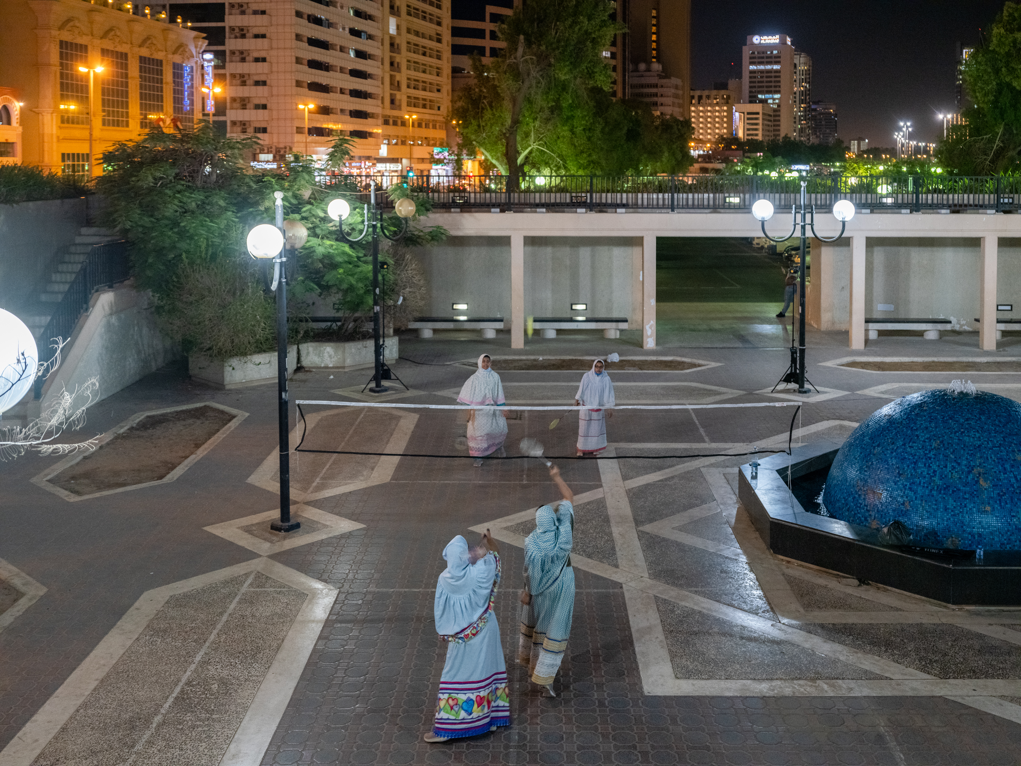 شابات من جماعة "بوري" يمارسن لعبة الريشة الطائرة حيث ربطن الشبكة بعمود الإضاءة في أحد الأماكن العامة بمتنزه في منطقة ديرة. يعود هذا المتنزه إلى حقبة الثمانينات عندما كانت هذه المنطقة أحد المناطق الغنية والفخمة.