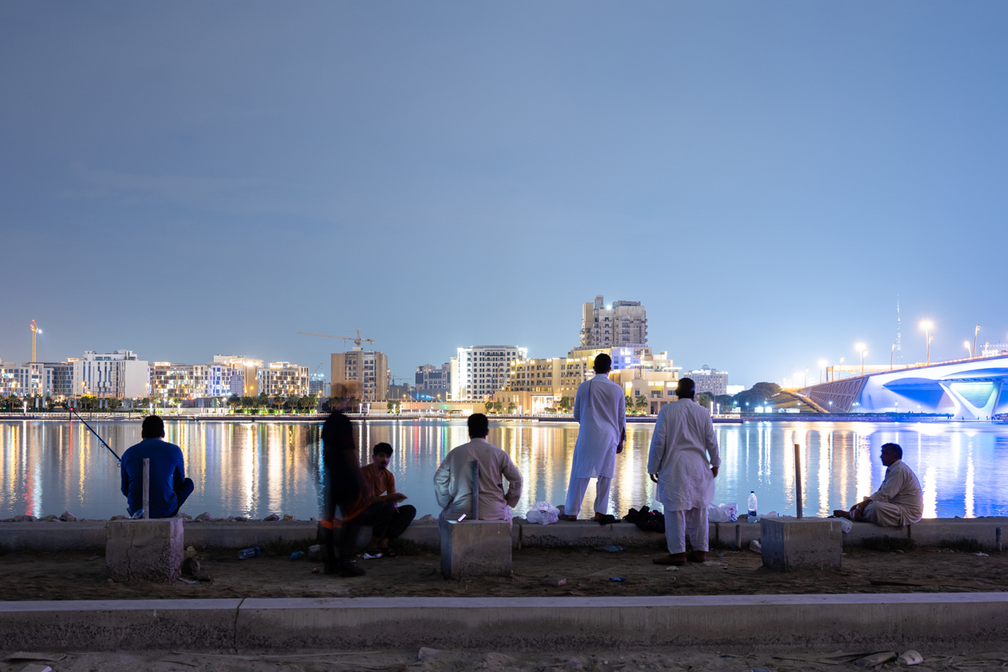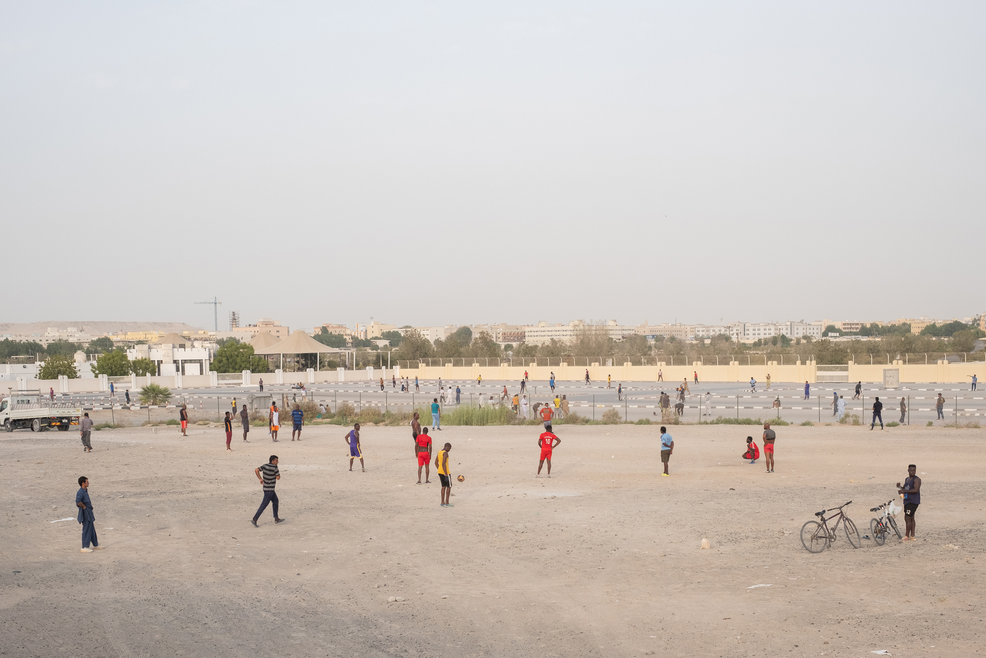 رجال يلعبون الكريكيت في أحد الأماكن القليلة المفتوحة في منطقة جُميرة، وفي الخلفية يظهر خط أفق مدينة دبي. المرافق الرياضية غير متوفرة للطبقة العاملة، على الرغم من الرفاهية في دبي، كما أن هناك أماكن عامة قليلة للمارسة الرياضة، مما يؤدي إلى ارتجال ملاعب للمارسة مبارة للكريكيت عندما تسنح الفرصة.