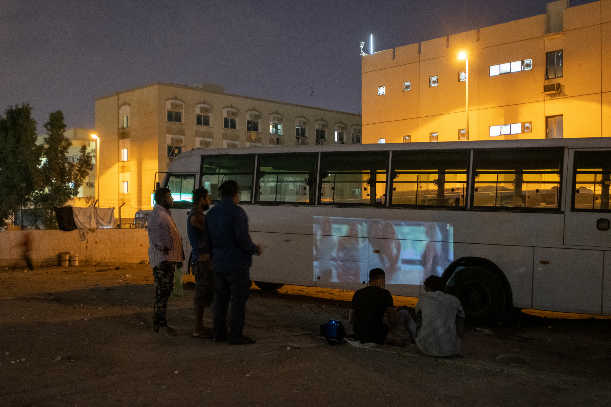 موقف سيارات خال في منطقة محيصنة يتحول إلى سينما/ مسرح مؤقت عندما يعرض مجموعة من الأصدقاء فيديوهات موسيقية باستخدام البروجكتور على جانب حافلة متوقفة.