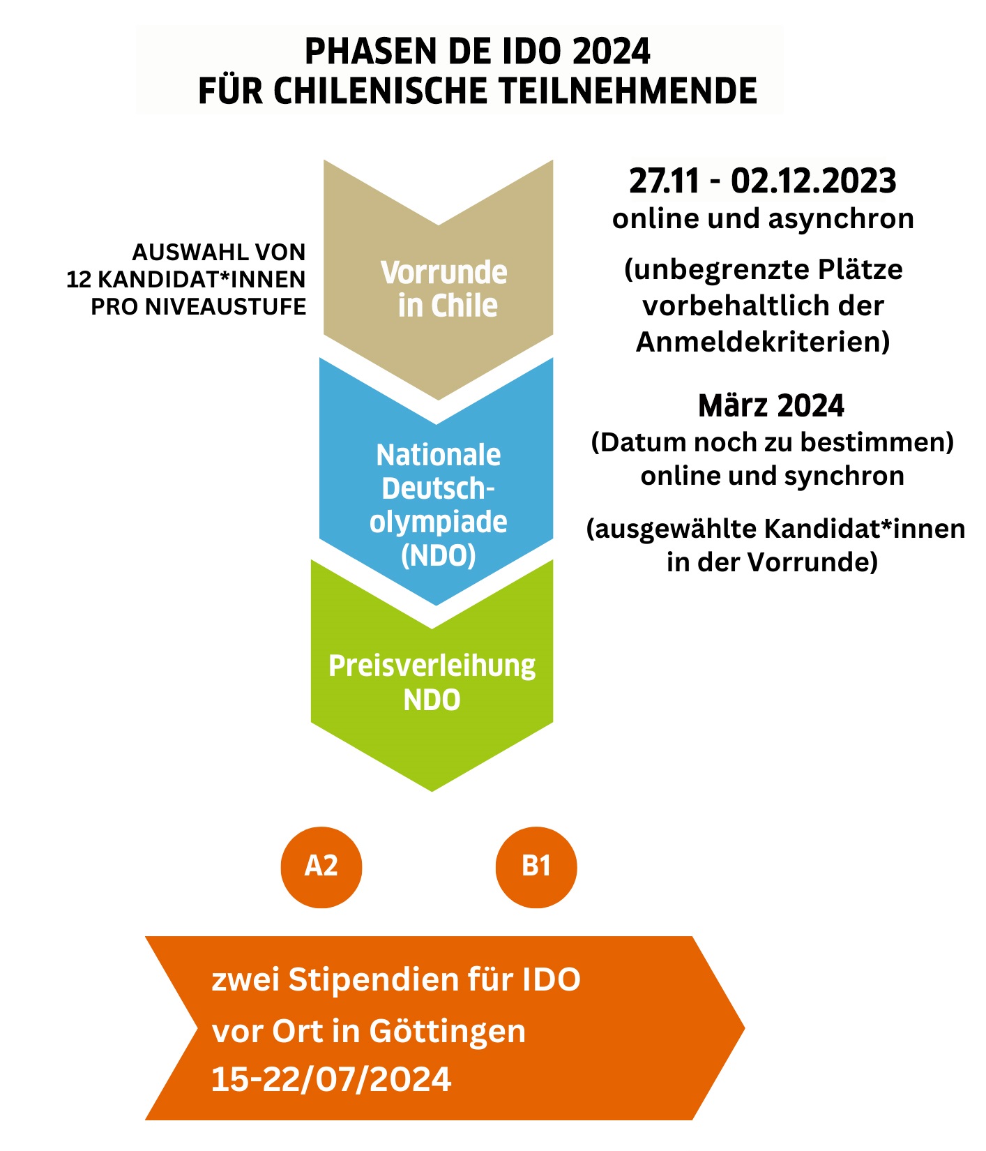 Rund 1.300 Schüler*innen von Schulen mit Deutschunterricht sind weltweit zur Teilnahme aufgerufen. Rund 100 Deutschlernende im Alter von 14 bis 17 Jahren qualifizieren sich in nationalen Vorentscheiden (NDO) in über 50 Teilnahmeländern und reisen im Sommer 2024 für das olympische Finale nach Göttingen. Eingeladen sind ebenfalls rund 50 engagierte Begleitlehrkräfte, die sich in Göttingen zu didaktisch-methodischen Themen fortbilden können.