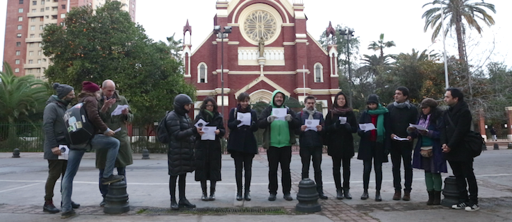 Habría que volver, entonces, sobre otra interrogante surgida en el trabajo del laboratorio: ¿para quién son estas acciones? ¿Para quién la memoria? Para esto habría que insistir en preguntarse por la naturaleza de esta acción. El tiempo reducido del laboratorio obliga a que las acciones no provengan de un trabajo vinculante con la comunidad como pudo haber sido en un trabajo de residencia, relaciones con juntas de vecinos, agrupaciones de estos jóvenes, etc. Se trata, por lo tanto, de una acción que debe ser evaluada según su eficacia performativa, en vínculo al performance art, el site-specific o la intervención. En ese sentido, se trata de una acción que debe ser autosuficiente en su potencial transformador y todo indica que no lo fue. Ocurre, entonces, que la infinidad de cruces posibles no emerge desde la experiencia de la acción sino del trabajo previo. Haber sido testigo de la experiencia completa del laboratorio permite identificar todas esas potencias que no necesariamente se activaron en el abordaje del parque.