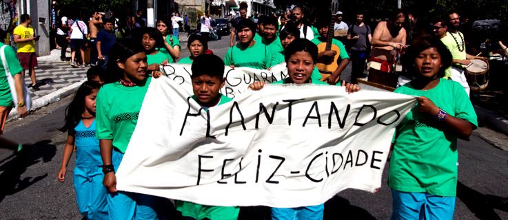 La aldea Kalipety del pueblo indígena guaraní Mbya es una comunidad semiurbana con más de dos mil habitantes asentados en el extremo sur de São Paulo. Esta aldea nació del movimiento de retoma de tierras tradicionales y fue reconocida como tal en 2016. Terreyro Coreográfico ha venido trabajando con esta comunidad para rescatar su memoria por medio de asambleas colectivas y de la coreografía de un ritual en Anhangabaú, un parque público situado en el centro de la ciudad.