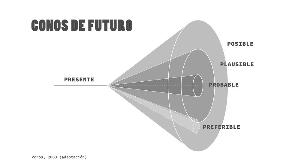 Más precisamente, el diseño “idea cursos de acción orientados a transformar situaciones existentes en situaciones preferibles”, según la descripción de Herbert Simon en su libro Las ciencias de lo artificial, publicado en 1969. El análisis de qué efectos esperamos con base en un determinado curso de acción –qué situación o qué futuro estamos proponiendo– es el punto de partida fundamental de un proyecto de diseño. Esto implica también una reflexión sobre el actual contexto y acerca de qué conservar, valorar y proteger. Si pensamos en el futuro como un cono de posibilidades que deriva del presente, tal como lo hizo Joseph Voros en su diagrama de “tipos de futuros”, propuesto en 2003, el futuro probable sería el más estrecho de todos. Es aquel que se presenta cuando las tendencias previstas se plasman o cuando los pronósticos relacionados con las tecnologías emergentes se concretan, por ejemplo. Es el futuro que suele estar en el imaginario de la gente, poblado de imágenes de robots, coches voladores y smart cities. Es decir, es un futuro único e inercial, que perpetúa la ilusión de pocas opciones disponibles y que probablemente ya ha sido imaginado por un grupo limitado de personas a quienes les interesa mantener los modelos dominantes.El desafío entonces consiste en imprimirle una mayor elasticidad a nuestra imaginación y expandir el espectro de posibilidades de futuros, proyectando artefactos, servicios, tecnologías y sistemas que habiten en esos escenarios. Siguiendo con el cono de futuros, podríamos pensar en un nuevo cono, el de los futuros plausibles, aquellos que son fruto de acontecimientos que poseen la capacidad de alterar de modo más drástico el curso de la historia, tales como una guerra, una catástrofe climática o, quién sabe, incluso una pandemia. Más amplio aún sería el cono de los futuros posibles, aquellos que son a menudo impensables, pese a ubicarse dentro del campo de lo que es físicamente posible que suceda (aun cuando sea improbable en muchos casos). Un futuro en el cual no existe el hambre en el mundo constituiría un ejemplo de futuro posible, toda vez que contamos con la cantidad suficiente de alimentos como para distribuirlos entre toda la población mundial, aunque esto no parezca algo que se concretará a corto plazo.