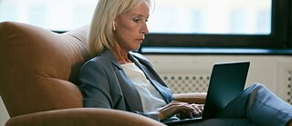 Eine Frau im Anzug sitzt bequem auf einem Stuhl und ist mit ihrem Laptop beschäftigt. © Unsplash