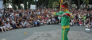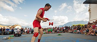 Bina je slobodna za DJuggledyja: veliki trg, open air bez visinskog ograničenja, ljetno vrijeme i, naravno, njegovi diabolo, lopte i štapovi za žongliranje – više mu nije potrebno da oduševi svoju publiku. Dreadlocks, zeleno-žuta trenerka i berlinska drska hvalisavost su zaštitni znakovi tog čovjeka punog energije. Svojim trikovima oduševljava gledaoce, vitlajući svoj diabolo, napravu za žongliranje u obliku pješčanog sata, vješto oko svog tijela, pa ga stalno bacajući nekoliko metara u visinu.