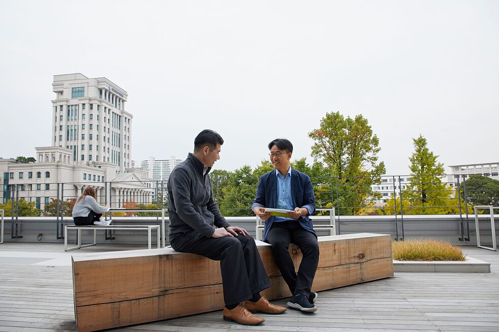Das endgültige Designkonzept der Bibliothek wurde nach intensiven Gesprächen mit der Universität und POSCO A&C gemeinsam erarbeitet. Auf dem Bild unterhalten sich Hyung-Taek Myung (links), Leiter des Academic Research Information Teams / HUFS und Hyung-Joo Seo (rechts), Leiter der Abteilung für Design / POSCO A&C.