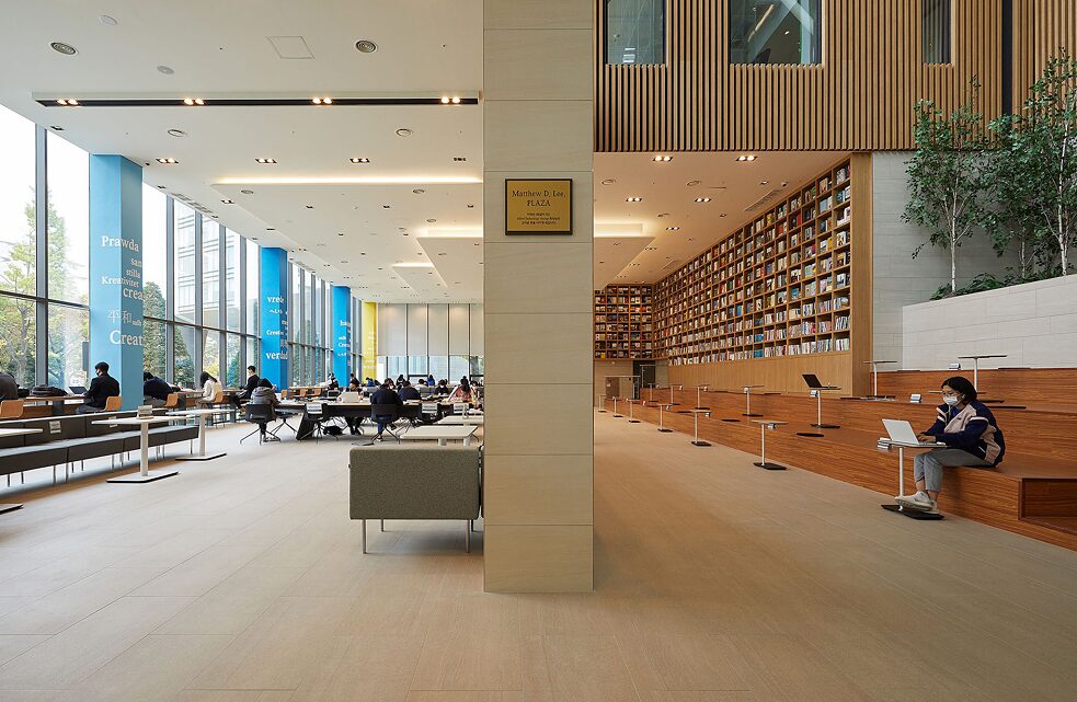 Die neue Bibliothek wurde im Auftrag der Hankuk University of Foreign Studies von Posco A&C, einem Architekturbüro, das sich bei seinen Bauprojekten auf Green Remodeling spezialisiert, entworfen und umgebaut. Die Universität wollte eine einzigartige, nachhaltige Bibliothek, die sich zeitgemäß weiterentwickelt. Das innovative Projekt gewann ebenfalls den ersten Preis beim fünften „Green Remodelling Best Practices Contest“ in der Kategorie Nutzgebäude.Die Universitätsbibliothek ist nun eine offene, smarte Bibliothek geworden. Das traditionelle Bild von einer eher stillen und nüchternen Umgebung hat sich zu einem Freiraum gewandelt, der berücksichtigt, dass es Studierende heutzutage gewohnt sind, an öffentlichen Orten wie Cafés zu lernen.