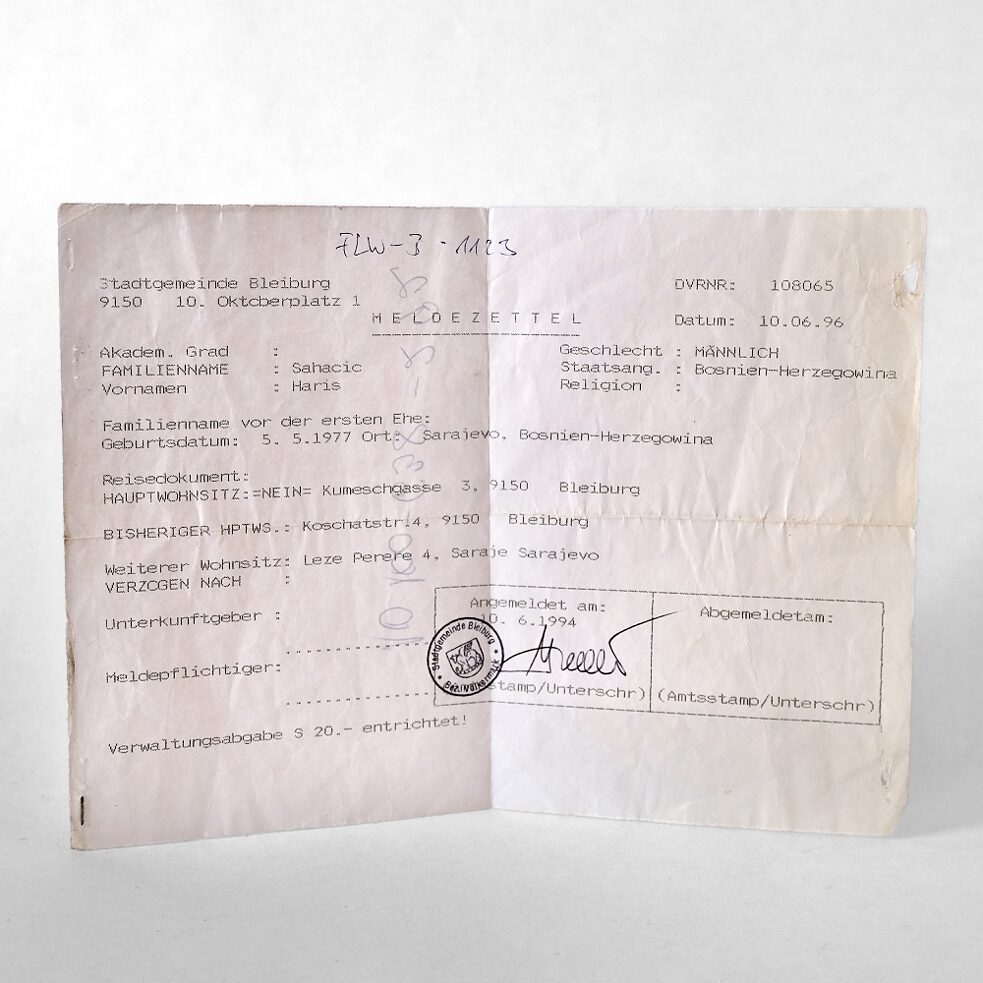 Haris Sahačić Das, was ich in der Hand halte, heißt in der Originalsprache Meldezettel, das ist eine gewöhnlicher Meldezettel, den jeder Flüchtling bei sich haben musste, zu jeder Tageszeit und zu jeder Nachtzeit. © Goethe-Institut