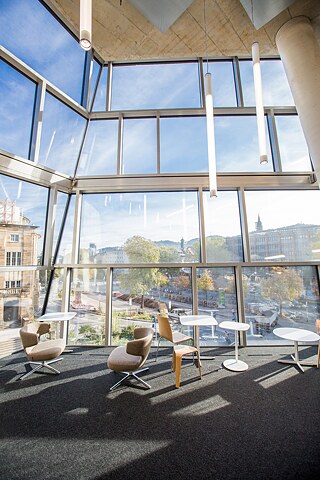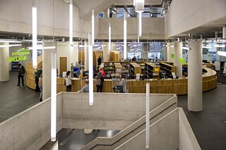 Über zwei große Drehtüren gelangt man in das großzügige Foyer mit der zentralen Information und Garderobenschränken. Das Café Libresso ist integraler Bestandteil der Bibliothekskonzeption, im Sommer gibt es eine Außenbewirtung auf dem Vorplatz. An den transparenten Fassaden, die einen attraktiven Ausblick auf die Altstadt und in den Schwarzwald bieten, finden sich insgesamt mehr als 1.750 moderne Benutzerarbeitsplätze. Treppen und Atrien reihen sich im nördlichen Teil des Gebäudes vom Erdgeschoss bis zum 5. Obergeschoss entlang der Fassade.