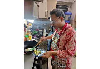 Chef Smart: In der ersten Phase besorgten wir die Zutaten für unsere Gerichte. Indisches Essen schmeckt am besten, wenn es mit frischen Zutaten zubereitet wird. Also kauften wir unsere Lebensmittel auf einem traditionellen Markt, einem „Sabzi Mandi“ am Chittaranjan Park. Gerade jetzt im Winter hätten die farbenfrohen Stapel aus frischem Gemüse das Herz von Fotograf*innen höherschlagen lassen. Für das vegetarische Gericht Shukto wählten wir Bittermelone, Moringaschoten, Kochbananen und ein wenig Kokosnuss. Außerdem kauften wir frische Methi- oder Bockshornkleeblätter und Huhn für das nicht vegetarische Methi Chicken. Für den Rest des Tages zogen wir uns wieder in unserer Küche zurück.
