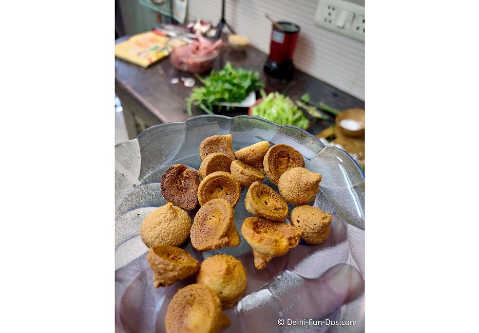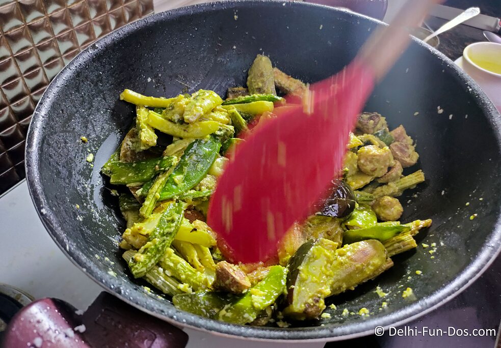 2. Heat oil in a big wok. Mildly fry all the vegetables one by one and set aside. Fry Bodi till it is brown and crisp and set aside.