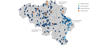 Unsere DaF-Landkarte bietet einen Überblick über Grund- und Sekundarschulen mit Deutschangebot in Belgien und zeigt auf: Hier wird Deutsch als Fremdsprache gelernt!