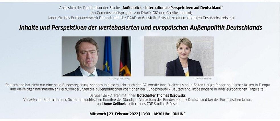 Am 23. Februar dieses Jahres hat das Europanetzwerk Deutsch gemeinsam mit der DAAD-Außenstelle in Brüssel zu einem digitalen Gesprächskreis mit dem Thema „Inhalte und Perspektiven der wertebasierten und europäischen Außenpolitik Deutschlands“ eingeladen. Den Anlass bildete die Publikation der Studie „Außenblick – Internationale Perspektiven auf Deutschland“ – eine als Gemeinschaftsprojekt von DAAD, GIZ und Goethe-Institut entstandene Erhebung zur Außenwahrnehmung Deutschlands, vor allem während der Corona-Pandemie.