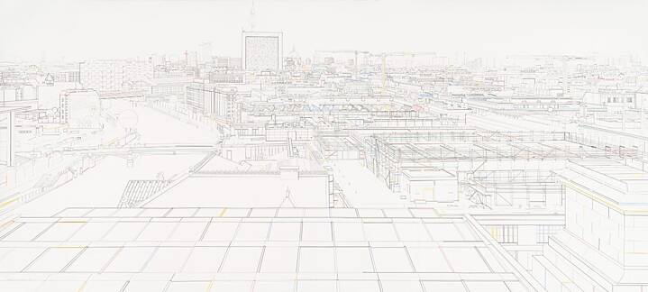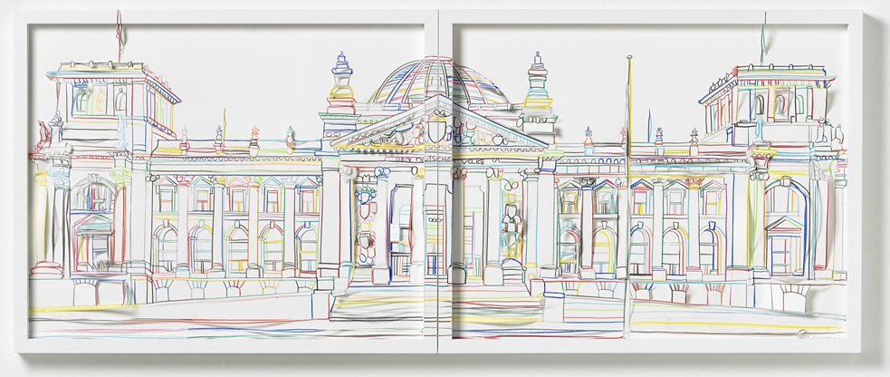 Ich habe das Werk "Handeln für Morgen" ausgewählt. Mich hat sehr fasziniert, wie detailreich und detailgetreu das Bild ist. Man erkennt die wichtigsten Wahrzeichen in Berlin wie den Fernsehturm, den Bahnhof Friedrichstrasse, die Spree usw. Für frühere Arbeiten hat die Künstlerin zuerst die Stadt erkundet und danach die Bilder erstellt. Die Arbeit im Bundestag war anders als Marion Eichmanns vorherige Werke, weil sie viel Zeit im Reichstag selbst verbracht hat. Welche Rolle hat die Stadt Berlin dabei gespielt?
