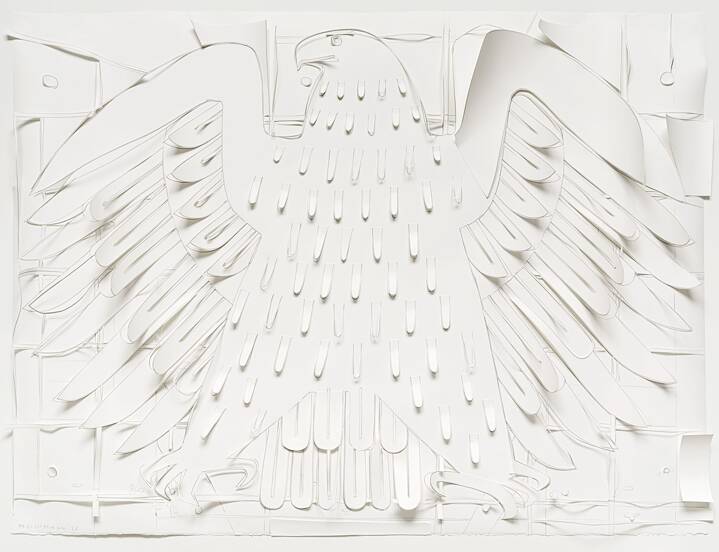 Der Adler, ein ehemaliges Symbol kaiserlicher Macht, befindet sich heute im Plenarsaal im Reichstagsgebäude und wird heutzutage als Symbol der deutschen Demokratie verstanden. Marion Eichmanns Adler erhält durch die Verwendung von Papier und durch die Technik der Collage eine Leichtigkeit und auch eine gewisse Luftigkeit, die der Symbolmacht als solches die Schwere nimmt, jedoch zugleich die Macht der Demokratie dem Volk näherbringt.