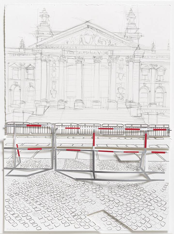 Ich habe das Bild “Dem Deutschen Volke” ausgewählt, weil es mich zum Nachdenken gebracht hat. Dieses Bild zeigt die Westfassade des Reichstagsgebäudes mit Barrieren. Die Fassade ist nur eine Skizze und steht etwas im Hintergrund. Die Fassade ist mit Graphit gezeichnet, wohingegen die Barrieren rot, grau und weiss sind. Dadurch entsteht ein Kontrast. Es scheint so, als ob der Schwerpunkt oder die Betonung auf den Barrieren liegt.
