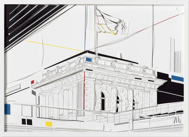 Die Werke von Marion Eichmann spiegeln den Versuch wieder, den Alltag eines Parlaments zu beobachten und die hochkomplexe Maschinerie der Demokratie in ihren Kunstwerken einzufangen. Sie richtet ihr Augenmerk dabei auf sowohl medial bekannte Räume und ikonische Fassaden als auch für die breite Öffentlichkeit kaum sichtbare Arbeitsräume, Maschinen, Hinweisschilder und Geräte. Mehr als einhundert komplexe und farbenfrohe Papierschnitte, Collagen und Zeichnungen sind innerhalb eines Jahres entstanden und zeigen das Parlament aus ungewohnten Blickwinkeln.