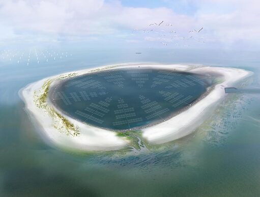The need to develop renewable energy sources on a vast scale pressingly forces us to think about how to shape power landscape typologies that are desirable, not just the technical result of engineering constraints. In 2018, the Dutch landscape architecture practice Feddes-Olthof responded to this challenge by developing the Energy Island project, treading new paths in the creation of innovative landscapes for sustainable energy supply. Designed as an artificial ring-shaped island of 5 km in diameter, it combines offshore windfarms, floating solar panels and seawater batteries for energy storage. The artificially created dunes will eventually turn into ecosystems such as mudflats and salt marshes hosting a diverse range of birds, with the potential to become an attractive destination for sustainable tourism.