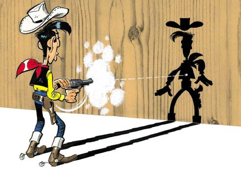 Aanvankelijk schreef hij zelf de verhalen, maar na een jaar of tien ging hij een beroep doen op een Frans-Argentijns-Joodse scenarist die hij in New York had leren kennen: René Goscinny, de legendarische scenarist van Asterix. Van 1955 tot aan diens dood in 1977 schreef hij de scenario’s. Goscinny zorgde daarbij voor een fikse injectie verwijzingen naar de Amerikaanse beeldcultuur, vooral naar de Amerikaanse western. Het album De postkoets is meer dan zomaar een knipoog naar de filmklassieker Stagecoach. En het personage Elliot Belt in De premiejager lijkt niet toevallig op Lee Van Cleef, de acteur bekend uit onder meer The Man Who Shot Liberty Valace en The Good, the Bad and the Ugly. Het maakt dat het in vrijwel elk stuk over Lucky Luke nog altijd over de link tussen Lucky Luke en de filmwestern gaat. Ook al omdat in de loop der jaren een paar verfilmingen volgden, en een animatiereeks werd gemaakt.Maar af en toe zijn er schrijvers die zich daar aan onttrekken. Soms met verrassend resultaat. In 1973 verscheen Schijnhelden en nepschurken, een boekje met beschouwende artikels over strips. Dat betekende toen nogal wat. Strips waren op dat moment nog een ondergeschoven kindje, en de auteurs van dit boek hadden een stevige reputatie. Het ging om de Nederlandse schrijver Rudolf Geel en de kunsthistoricus Rudi Fuchs, die later onder meer bekend zou worden als directeur van het Stedelijk Museum in Amsterdam en als curator van documenta 7 in Kassel. Hun kijk op strips is even erudiet als verfrissend. Zo zien zijn Lucky Luke niet als een getekende pendant van de filmwestern, maar als een variatie op de commedia dell’arte. Niet film is hun referentiepunt, maar het theater.