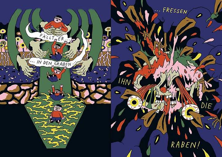As always, one of the highlights of this year's Comic Salon in Erlangen was the presentation of the Max and Moritz awards. Feuchtenberger and Rummler were also among the nominees. But the prizes went to others. Nando von Arb was honoured as best German-language comic for his graphic novel Fürchten lernen (Learning to fear). In it, the Zurich-based author deals with very different personal experiences of fear. Already as a child, he suffered from anxiety disorders and panic attacks. In terms of illustrations, the jury found Fürchten lernen to be "simply spectacular. Most pages consist of a single drawing, elsewhere two or three panels flow together into a masterfully designed picture. The drawings are dense and colourful, stylised and expressive, abstract and sensual - ... a dizzying ghost train through a maze of fears. And yet Learning to Fear also has a cheerful and whimsical side. This humour is perhaps proof that von Arb has overcome one or two fears".