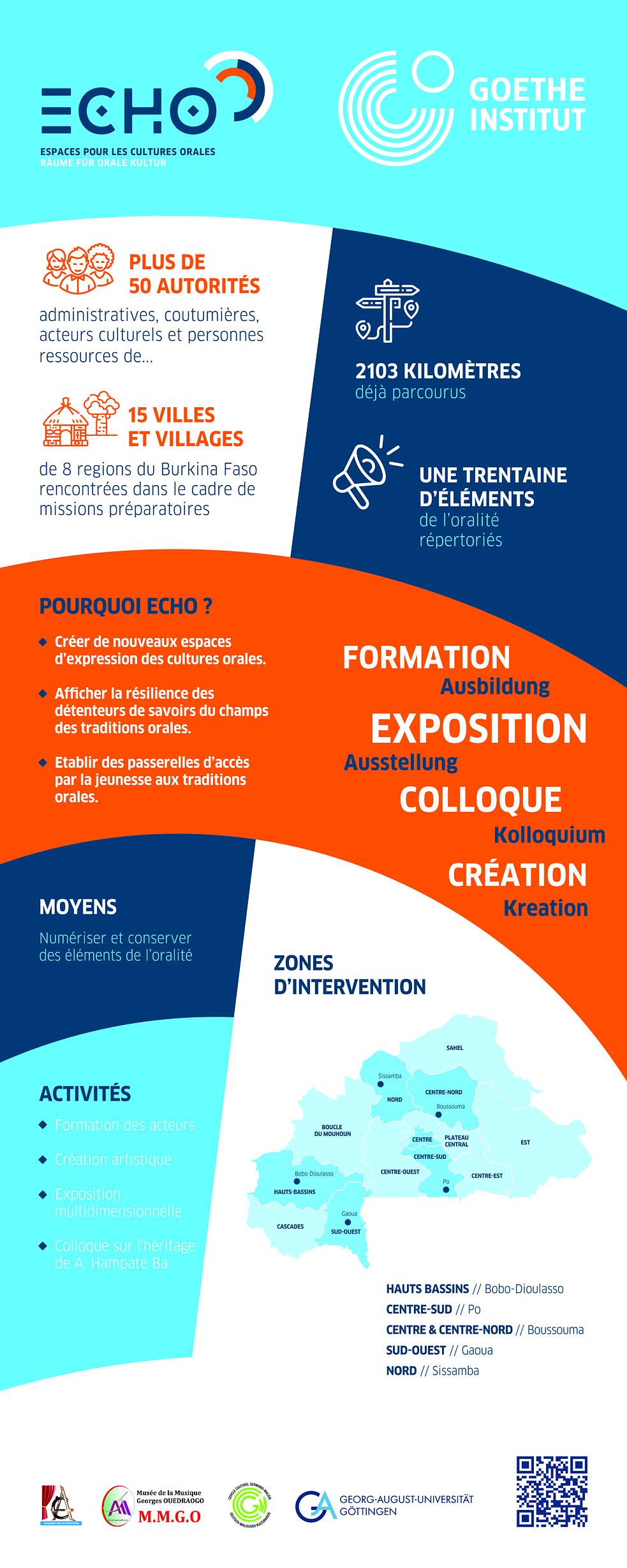 Allerdings stellt sich die Frage in Zeiten von sozialem, politischem und wirtschaftlichem Wandel, wie wie orale Kultur und diesen Veränderungen standhält und auch in solchen Zeiten repräsentiert und gestärkt werden kann. Dieser Problemstellung widmet sich das Goethe-Institut Burkina Faso gemeinsam mit lokalen und internationalen Projektpartnern im Rahmen des „ECHO“-Projekts: „ECHO“ steht für „Espaces pour les cultures orales“, auf deutsch „Räume für orale Kultur“.