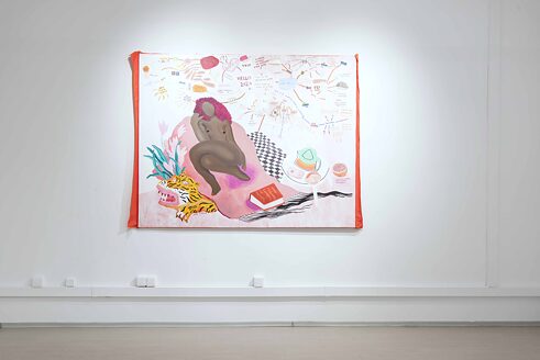 Der morgige Tag als intimer nach innen gewandter Blick steht in der Arbeit von Harita Asumani im Mittelpunkt. Ja, genau wie der Titel sagt, als ein "Raum-Zeit-Kontinuum", ein Konzentrat aus einem ganzen Jahr mit seinen 365 Tagen und unzähligen Träumen, aus dem ein Destillat in Form eines gemalten Selbstporträts und eine collageartigen mental map aus Wünschen und Plänen entsteht. In Asumanis Werk finden sich ein spezifischer Optimismus und ein ganz besonderer Humor – der sich vor allem gegen die Künstlerin selbst richtet. Und es scheint, als ob dieser rosarote Optimismus von der jungen Generation von heute dringend gebraucht wird.