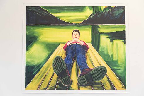 Dina Stoevs Arbeiten sind wie ein Spiegel - sein eigener Spiegel. Wir betrachten die Gesichter in Dina Stoevs Gemälden und es ist fast immer ein und dasselbe Gesicht, das methodisch und sorgfältig mit jedem weiteren Bild aufgebaut und gefestigt wird. Mit einem fast literarischen Ansatz kreiert und entwickelt Stoev - nach seinem Ebenbild - einen Protagonisten, der allmählich eine solche Dichte erhält, dass wir uns nicht mehr sicher sein können, ob er real, ein Spiegelbild oder eine Fiktion ist. Diese Figur sehen wir plötzlich in einer mörderischen Perspektive, die uns mit der Geschwindigkeit eines Schnellzugs in die Zukunft bringt. Die Figur ist jedoch statisch, sie scheint fast eine Leiche zu sein. Und genau wie der Körper ist auch das Gesicht irgendwie leichenhaft, in einem unbeschreiblichen Entsetzen und vor Überraschung verzerrt, die eigentlich nur der Tod hervorrufen kann. Mit seinem "Polarlicht" bringt Dina Stoev die Angst vor der Zukunft und ihre Unvermeidlichkeit zusammen.