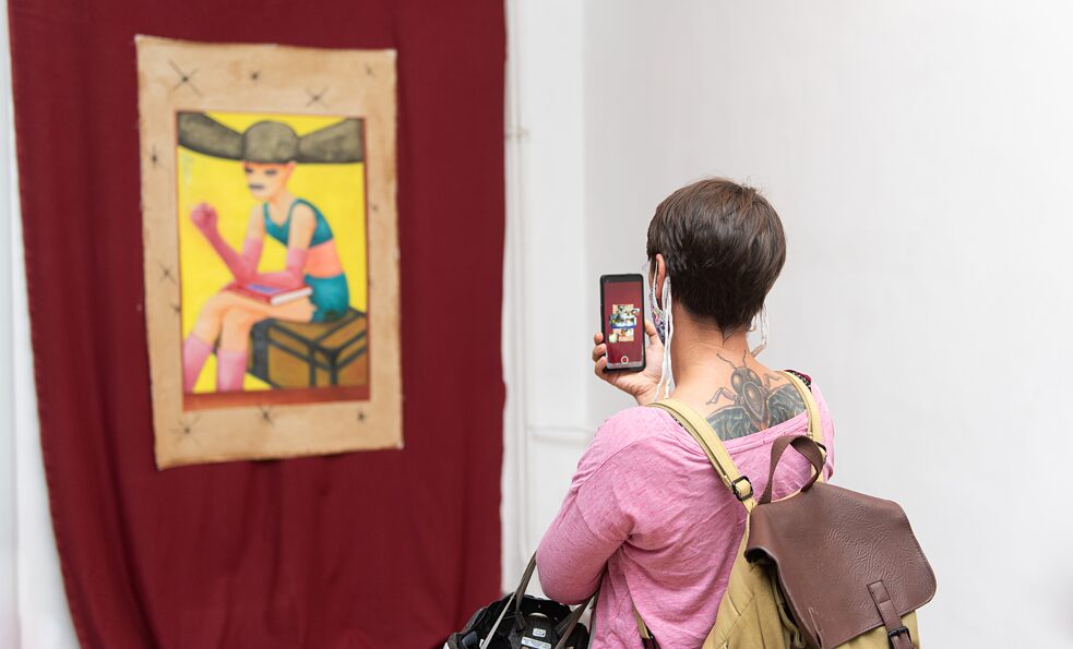 Peter Odinzov geht von seiner persönlichen Familiengeschichte und einem Gemälde aus. Das einzige Gemälde, das er besaß, befand sich im Haus seiner Familie, in dem er das erste Mal Interesse an der Kunst zeigte. Dieses Gemälde, ein kitschiges Frauenporträt, von dem er später feststellte, dass es sich um einen billigen Druck auf Leinwand handelte, taucht immer wieder in seinen Erinnerungen an seine Kindheit auf, aber auch in der Beziehung zu seiner Mutter und in seinem Prozess, seine queere Identität zu erkennen. Odinzovs persönliche Erzählung ist verwoben mit seiner späteren Erkenntnis, wie sehr sein sozialer Status als Immigrant in Deutschland sein eigenes Bewusstsein und seine Verwirklichung als Künstler und queere Person beeinflusst hat, sowie mit seiner theoretischen Beschäftigung mit der Theorie der Machtverhältnisse und des Klassismus. All diese Erinnerungen und Reflexionen stehen im Mittelpunkt der vielschichtigen Installation „Lady with a Hat“, die eine malerische, zeitgenössische Interpretation des Kinderporträts und „Augmented Reality“ (zugänglich über die Artivive-App) umfasst.