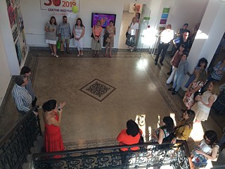 Die Kuratorin Elisaveta Petrova ermöglicht uns nicht nur einen interessanten Einblick in die 30-jährige Tätigkeit des Goethe-Institutes Bulgarien, sondern auch in die Historie des Gebäudes Budapester Straße 1, welches uns derzeit beheimatet. Dargestellt wird die Erfahrung einer Institution, die sich immer an der Grenze zwischen zwei Ländern befindet und immer versucht, Sie einzuladen, diese Schwelle zu überwinden.