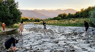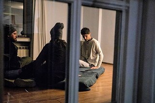 Zwei Männer und eine Frau sitzen am Boden und unterhalten sich.