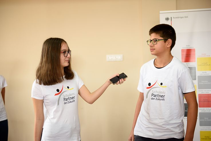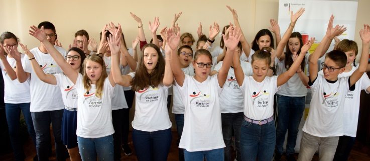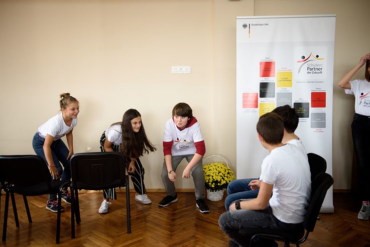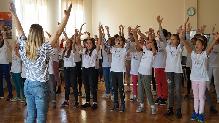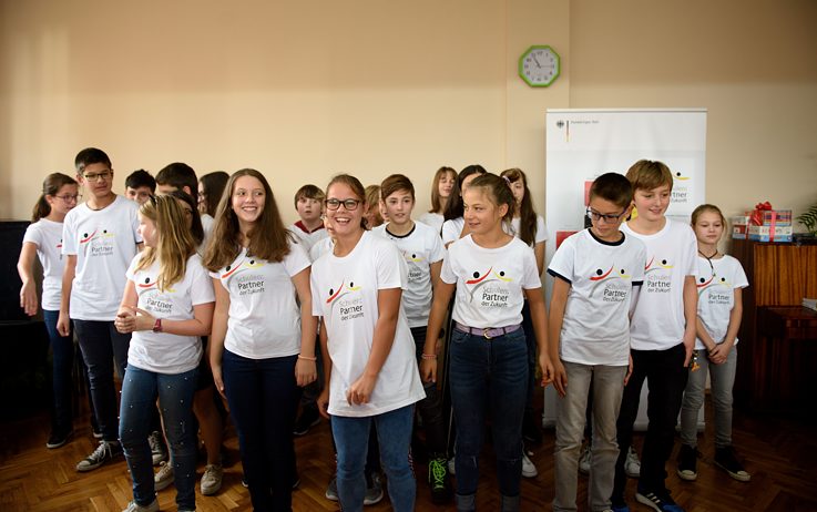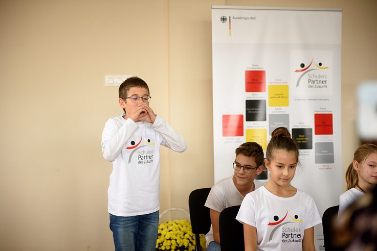 Am nächsten Tag konnten die Schülerinnen und Schüler die Ergebnisse des Workshops vor Publikum präsentieren – bei der feierlichen Aufnahme der 19. Schule „Elin Pelin“ ins weltweite PASCH-Netzwerk. Sie spielten ihre kurzen Szenen der Zukunft vor: In der einen wurde eine Schulklasse von einer Roboterlehrerin unterrichtet, in der anderen gab es eine Reise zum Mars. Zum Abschluss stimmten sie gemeinsam die Textzeile „Ich bau ne Stadt für dich“ an und zeigten ihre Choreografie zu dem Refrain des Songs „Stadt“.