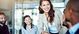 Eine Gruppe junger Geschäftsleute in einem Sitzungsraum; eine junge Frau reicht einem Mann die Hand.