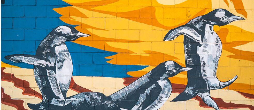 Ihr Werk „Die neuen Kamele“ zeigt einige Wüstendünen in rötlichen, gelben und violetten Farben. Über den Sand gehen mehrere schwarz-weiße Pinguine, die das heiße Ökosystem durchqueren.