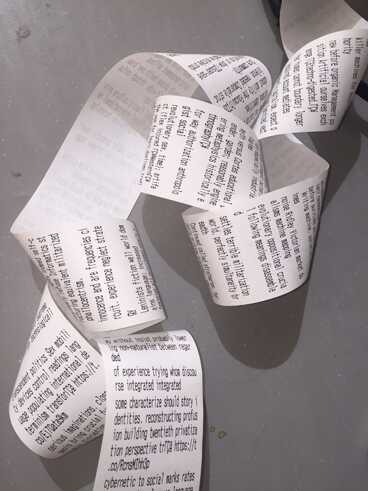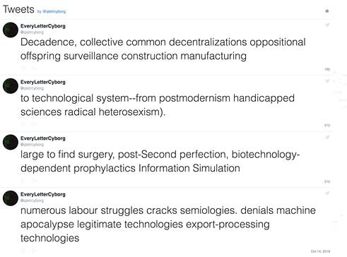 Man kann das Argument anführen, dass sich die Intelligenz der Maschine unseren üblichen Kriterien entzieht, doch nicht sie ist es, die dies verursacht hat: wir waren am Anfang diejenigen, die das wollten. Damit die Maschine Zufälliges produzieren kann – und damit etwas, das nach unserer Auffassung zu ihrem Wesen gehört – war es zunächst erforderlich, dass jemand dies wollte und selbst in der Lage war, es zu konzipieren. Und es war schließlich erforderlich, die Maschine zu programmieren und das Computerprogramm zu implementieren. Den Transfer von Autorität haben die Dadaisten, Situationisten und William S. Burroughs bereits demonstriert. Zu den Vorläufern des computerbasierten künstlerischen Schaffens gehören analoge Methoden wie Cut-Up, der psychogeografische Ansatz der dérives sowie andere Methoden der Neukombinierung. Seit der Jahrtausendwende sind zahlreiche Werke in diesem Bereich entstanden, oftmals im Internet angesiedelt, deren Werkstoff – in der Regel textbasiert – der Maschine entstammt, unkenntlich und verklärt. EveryLetterCyborg V1.2 (2017-2018) der in China geborenen und in Toronto lebenden Künstlerin Xuan Ye ist stellvertretend für diese Art von Werken. Es ist eine Kombination aus interaktiver Installation und TwitterBot, die von einem bestehenden Text ausgeht und daraus einen neuen, komplett dekonstruierten Text schafft. In diesem Fall wurde der Ausgangstext A Cyborg Manifesto von Donna Haraway (1984), „neu geschaffen“ mithilfe eines Algorithmus auf der Grundlage einer unbeabsichtigten Kompositionsmethode des Dichters Jackson Mac Low aus den 1960ern. Jeder Buchstabe des Manifests ist der Beginn eines neuen Wortes nach dem Zufallsprinzip auf der Basis der Datenbank eines Online-Wörterbuchs, dessen Anordnung nicht den üblichen Syntaxregeln entspricht. Jeder Buchstabe wird außerdem ein Cyborg, ein Micro-Golem der Informatik, bei dem das literarische Originalwerk seine digitale Hybridisierung in Echtzeit erlebt, und zwar gleichzeitig in der wirklichen Welt und per Twitter.
